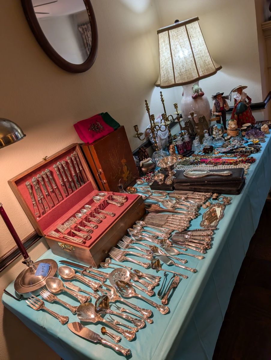 We're in Preston Hollow this week! Jewelry (Eddie Chee Navajo sterling earrings, Kenneth Jay Lane, Vogue Bijoux, assorted costume) Gorham "Chantilly" sterling flatware, huge amount! 5 pc place setting for 12, 5 pc place setting for 6, 4 pc place setting luncheon setting for 6 (short 3 spoons), large assortment of serving pieces, demitasse spoons, ect. Collectibles (Tiffany & Co Sterling, Misc antique Sterling serving pieces, Antique silverplate Apostle spoons, 2 boxed sets Antique silverplate fish servers with bone? handles, Royal Doulton, Herend, Cut to clear, Italian paper mache Nativity set, Antique brass, Antique Asian ceramics, Amethyst, Spode, Vintage Neiman...