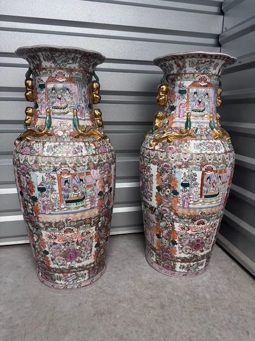Huge pair of vintage Rose Medallion vases in excellent condition. Henredon campaign chests custom laquered in white with brass hardware. 2 chests available. Cypress knee coffee table with custom cut glass top. Huge tree lamps. Set of 2. Mongolian hair gold counter stools. Set of 3. Tulip chairs grey set of 2. Rose Medallion garden stool. Antique bombay chest with custom marble top. Antique solid walnut dresser with mirror, and chest of drawers. (Belonged to my grandmother) West Elm tulip table with round gold base and marble top. Antique Singer table top sewing machine. White wicker storage chest. Vintage elephant...