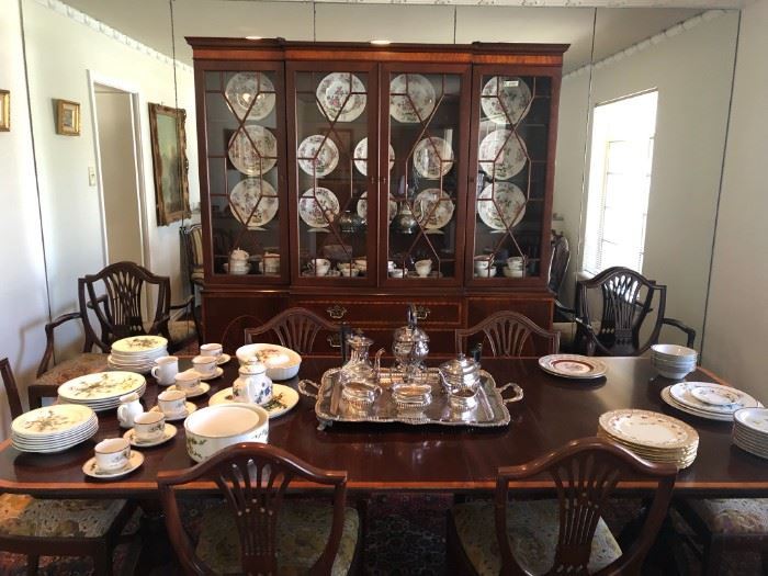 Items include: Banded Mahogany Double Pedestal Dining Table & 8 Chairs, 19th Century Mahogany Banded Marble Top Table, 1930’s Mahogany Secretary Desk, Baker Mahogany Breakfront, Inlaid Italian Coffee Table, Pair of Bergere Chairs, 2 Full Size Beds – 1 Cherry & 1 Mahogany, 19th Century Mahogany Chest on Chest, Mahogany Dresser & Nightstand, 2 Nice Sofas, Original Engraving by Giovani Battista Piranesi, Several 19th Century Engravings, Several Pairs of Nice Lamps, Oriental Wall Screen, Display Cabinet, Antique Box Collection, Lladro Collection, Mahogany Acrosonic Spinet Piano, Large Set of Charnwood by Wedgwood, Villeroy & Boch Set, Bronze by Hudon, Antique Chemist...