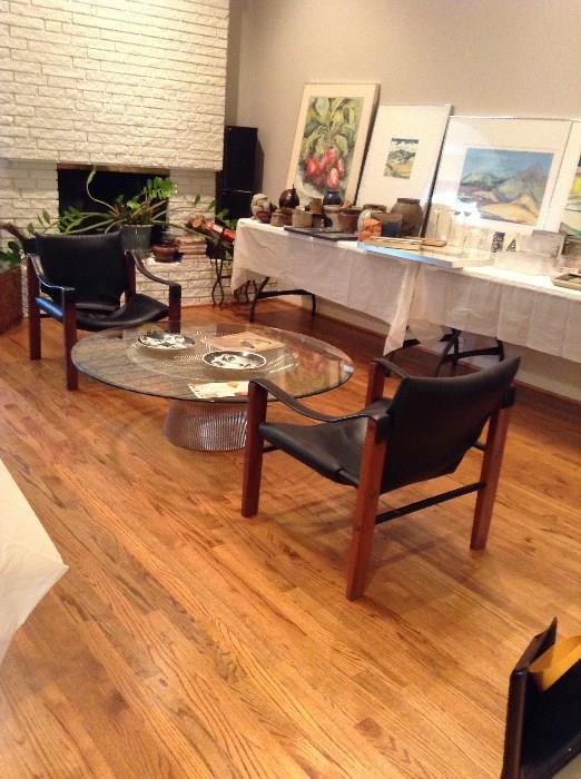 Estate of Dallas Artist Carol Vystrcil Scott: Celebrating the life and work of listed Texas Artist ....her paintings, Mr. Scott' s pottery, their design appreciation shows thru out their home: Warren Platner coffee table, Arkana black leather & teak MCM chairs, their collections, & her love of entertaining. Home is full !! Front Room ORIGINAL Artwork and pottery thru out, Art Deco Alabaster stork table lamp, old postcard photo album, cut crystal, cut to clear tumblers, Royal Krona paperweight, frosted birds from France, Sasaki bird decanter, pressed glass, mid century glass & pottery, milk glass, hand painted Nippon & Occupied...