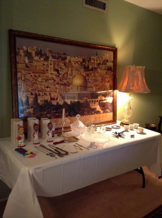 Large print of Israel- from Israel, Mavericks bobble heads from dr pepper bottling, cell phone case, seiko watches, some costume jewelry, leaded crystal, glass ware, blue angels model planes, tea cup from Germany, Asian faux florals and decor, kitchen table with chairs, pots and pans, flatware, knives, enamel, big ironstone bowl, toaster oven, coffee pot, mink pie plates, tea pot. Mid century furniture including oak dining set with 6 chairs and matching China cabinet. King size metal bed with mattress, queen size bookshelf headboard bed with mattress. Bedding, some clothes and shoes. Accent pillows. Mid century accent chair with ottoman....