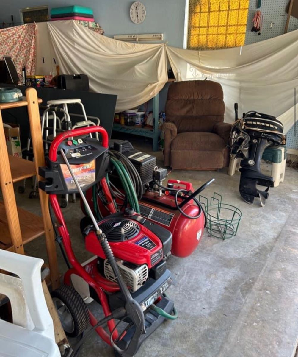 POWER WASHER. MERCURY BOAT MOTOR. AIR TANK. FABRIC RECLINER. SMALL SHELVES. HEATERS.