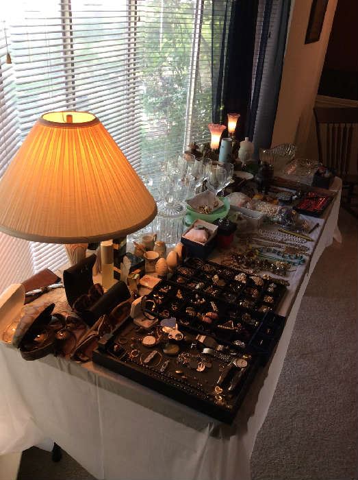 This sale is packed with Goodies for everyone! There is jewelry for the ladies and a garage full of tools for the guys and much more! Jewelry table Fine Jewerly:14k, 10k class rings. 10k and diamond cocktail ring, Platinum collar pin. Illinois & Elgin pocket watches. 14k & Onyx Necklace. Sterling Charm Bracelet. Swarovski rings. Mens watches. Costume Jewerly. Ladies eyeglasses. Coco Chanel perfume. Men's straight razor. Pocket knives. Brass Hong Kong Foodogs bookends. Annalee holiday. Jadeite color Fireking Measuring Bowl. Drafting set. Antique toy tops. Vintage ilco key machine. Asian jewelry box. Baseball and football cards. Hand-painted porcelain. .Hand...