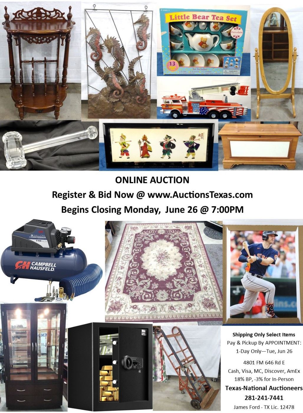 Register & Bid @ www.AuctionsTexas.com Bidding begins closing Monday, June 26, 2023 @ 7:00PM We have a huge variety including lots of Furniture, Antiques & Collectibles, Tools, Air Compressor, Appliance Dolly, Toys, Sports Memorabilia, Outdoor Sporting Goods, Cameras & Projector, Telescope & Microscopes, Safe w/Electronic Combination, Wii, TVs, Casio Keyboard, Jewelry, Antique Books, Cuckoo Clock, Persian Rugs, Oriental, Steamer Trunk, Mirrors, Lamps, Decor, Home & Garden. Many New, Lots of Good, Lightly Used items & MUCH MORE... TOO MUCH TO LIST! Register & Bid @ www.AuctionsTexas.com Bidding begins closing Monday, June 26, 2023 @ 7:00PM AUCTION PREVIEW & INSPECTION: By...