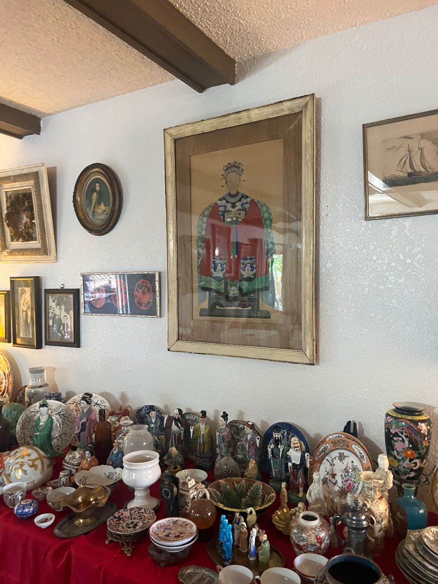 House is full of beautiful Asian antique decor, rare early medicine bottles, rare antique photos, old books, vintage hot wheels collection, tons of costume jewelry and jewelry, furs, vintage hats and clothing, , tins of crystal early glass, and Americana. Lots of rare art and something for everyone- decorative pieces galore!