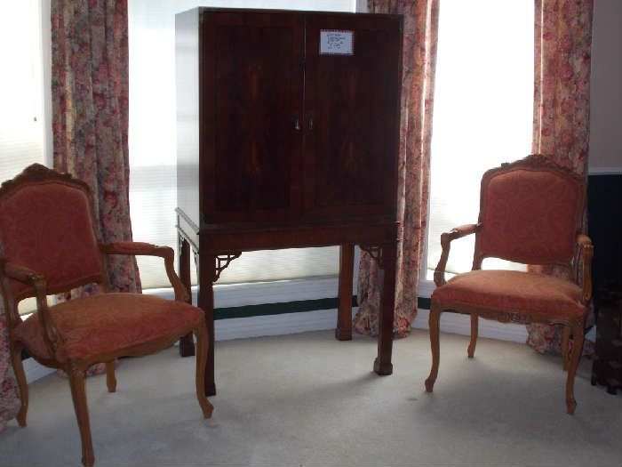 Leaving behind third generation antiques and collectibles. Two charming antique bedrooms inc'l an antique iron bed, antique dining table, marble top servers and entry table. Old wood chests, Drexel Heritage leather sofa and matching chair and ottomon, nice arm chairs, Chinese chippendale cabinet, pine fireplace mantel, oriental screens, jewelry, Worchester eversham china, old records, war games, lots of blue and white smalls, outdoor patio set,Weber bar-b-que. garage and much more.