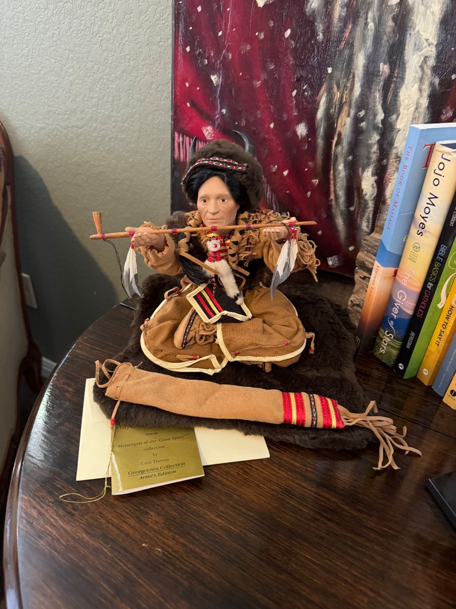Client did drumming out on her property. We have Native American collectible dolls and painted ponies, signed and numbered prints, original oil paintings by Cameron Graham, generator used twice, yard tools, heaters, books, furniture, Native American figurines, vintage glasses, crockery, Paperdoll books, lawyer’s bookcase, antique chaise, antique chaise, vintage Victorian sofa, wingback chairs, slipper footed chairs.
