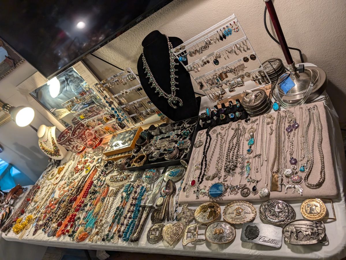 Let's go, Cowfolk! Time to saddle up. We're in Forney this week! Jewelry (10k and 14k gold, Sterling, Mexican Sterling, unmarked Squash Blossom necklace with green Turquoise, belt buckles, bolos, ect. Large amount of costume jewelry, morgan and peace silver dollars) Collectibles (Perfume bottles, Cut to clear, Fostoria "American" crystal, William Yeoward "Iona" crystal, Murano, Jim Beam decanters, Cut crystal, Crystal decanters and bowls, Vintage teacups, Art glass, Depression glass, Head vase, Masonic hat, Masonic sword, Masonic bible, Vintage Cranberry flash glassware, Bayel Bacchante champagne glasses, Crystal lamps, Crystal chandeliers, Embassy Vitkified "Lord Mayfair" china, Frankoma, Military uniforms, Edelstein Bavarian...