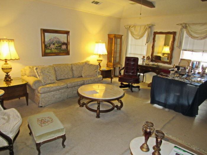This Sale offers a wide range of unique items available for purchase. Home furnishings for living, dining, bed and bath. Decorator pieces ranging from antique, vintage and contemporary. Genuine decorative estate items collected over 93 years. Mirrors and wall art. After 5 and casual clothing for women. Mrs. Bass was quiet the artist and there are many original framed oils in this sale, Unique Gorham "Gold Forum" china - service for 8, Dresden figurines in perfect condition, Several Capo-Di-Monte Italy pieces. Including smoking set with lighter, trinket box, centerpiece pedstal bowl, single table lamp, Several Dresser sets, Pair beautiful statue...