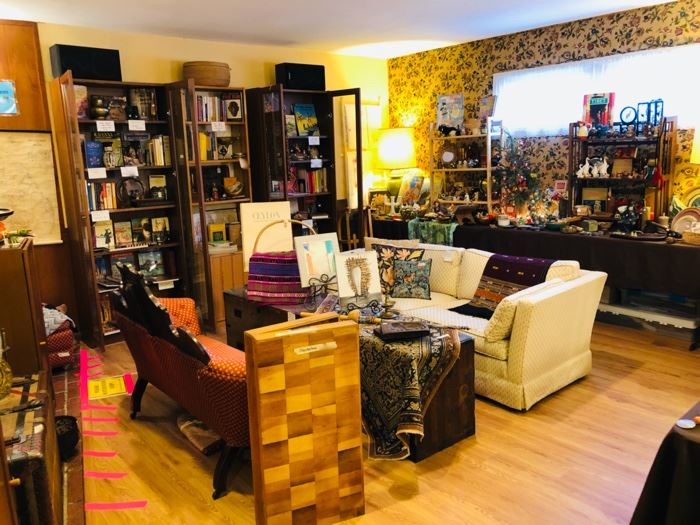 PACKED super interesting estate sale! Family lived in China late 1920-41. Lived in Ceylon in the 1950s Valuables removed each night! Security on premises. Police patrolling. Antique Chinese items including kingfisher feather jewelry, jade, antique bronze wax seals, antique stone beads, silver spider web hair ornaments, embroidered robes and clothing, eyeglass container, dragon roof ornament, wedding bed sheet silk hanging, silk embroidered wall hanging, old shoes, hat, old composition and wire miniature toy parade set, ink stone, jade belt buckle, carnelian and other stone belt buckles, old enamel pieces, and more! Tons of very interesting vintage and modern books! Beautiful...