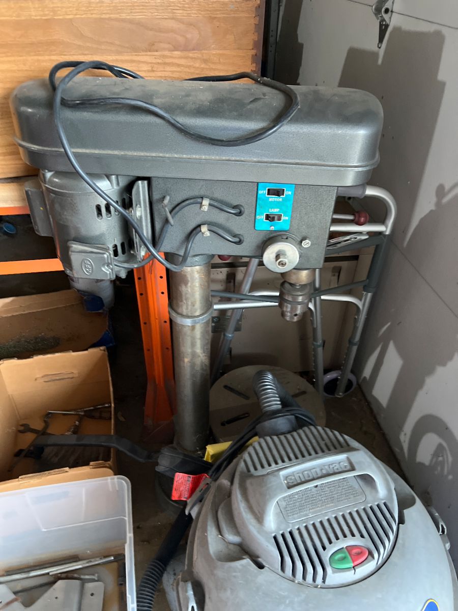 Cast Iron skillets, Corning Ware, Pyrex, Tupperware, Olympia Pl by Lenox China, Microwave, Linens, Jewelry, Books, Pub Height dining room table, Outdoor umbrella, Thermos grill, Swing, Whirlpool Refrigerator, Piano and bench, Toms Toasted Peanuts Cabinet, Air compressor, Extension Ladder, Bearing Press, Large bench grinder, Large table top drill press, Hand held tool boxes, Yard Cart, Shop Vac, Leaf blower, Yard tools, Fishing poles, Dolley, Saw horses, Large metal and wood workbench, Hand tools, Queen bed, Corner desk, Filing cabinet, Pop by Funko over 40 boxes, Christmas items, Comic books, baseball and basketball cards,