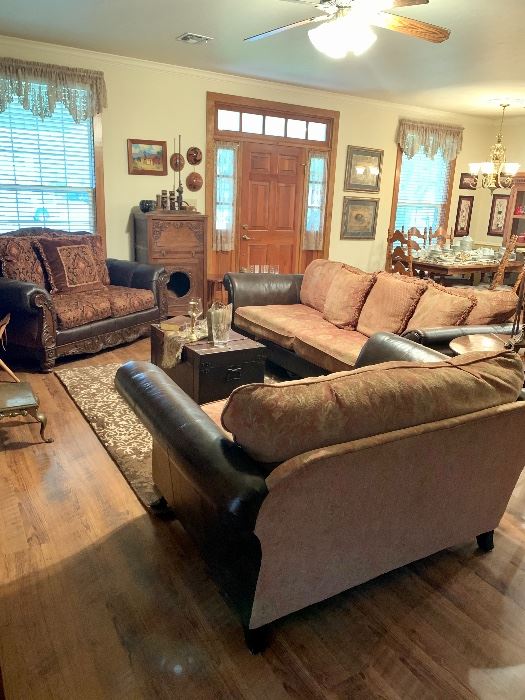 Masks Required Leather / Fabric Sofas Occ. Chairs Missionary style recliner Wingback chair Swivel rocker Primitive Style Display Cabinet Dining Table / Ladder back chairs Table/ chairs Barn door TV Entertainment Center TV Console Trunks King fabric H/Board King Matt. Set Twin tempurpedic matt. Set Dresser / mirror, Night stands Lingerie Chest Jewelry Armoire Desk Roll top Desk Misc. Furniture Antiques Home Décor Lamps Linens Collectibles Sets of Dishes Glassware Electronics Books Art: Signed Prints Canvas Art Originals Sale Room: MIsc Furniture Outdoor: Sets of Patio Furniture Yard Art Jewelry: New collection of Avery, Gold, Sterling Packed Garage!! TOO Much...