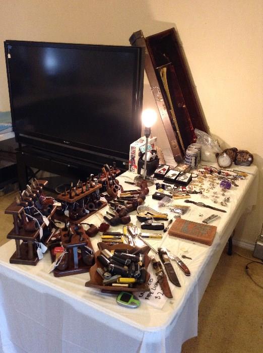 Full house!! There are ladies vintage fashion ware, and ladies costume jewelry, some gold, but this is mostly a vintage man cave!! Living Room: Large collection of vintage Pipes - Edwards, Sasieni, pipe supplies, pipe stands. SHOTGUN: Browning A5 Semi Auto 12 gauge, manufactured under license by Remington in New York factory. Pocket knives, lighters, Saxophone, Trombone, Steins, gun supplies, ammo, Large entertainment center- Sony TV, vintage furniture, lots of books and records, and 45's, framed artwork, china and crystal. Queen knife, Winchester, puma, swiss army, geodes, jewelry: gold pieces vintage fraternity pins, girzel beer steins. Furniture: love set and...