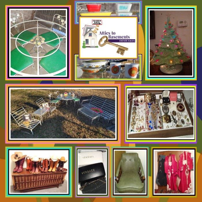 WOODARD Vintage Daisy Bouquet Wrought Iron Patio Set • Vintage Pyrex • Corning Ware • James Avery • Versace • Costume Jewelry • Belt Buckles VINTAGE WESTERN WEAR : (Boots men's size 9, women's size 5) • Tony Lama • Justin • Steton • Bradford • Miller Outerwear • Pearl-Snap Weastern Shirts • A Pair of Mid Century Lamps • A Pair of Spanish Colonial Dining chairs • Sofa and Loveseat by Hillcraft Furniture • A Pair of Vintage Brass Side Tables • Aladdin Young II Propane Heater; J380 Model. • Outdoor Insect Killer • Vintage Eskimo Electric Fan •...
