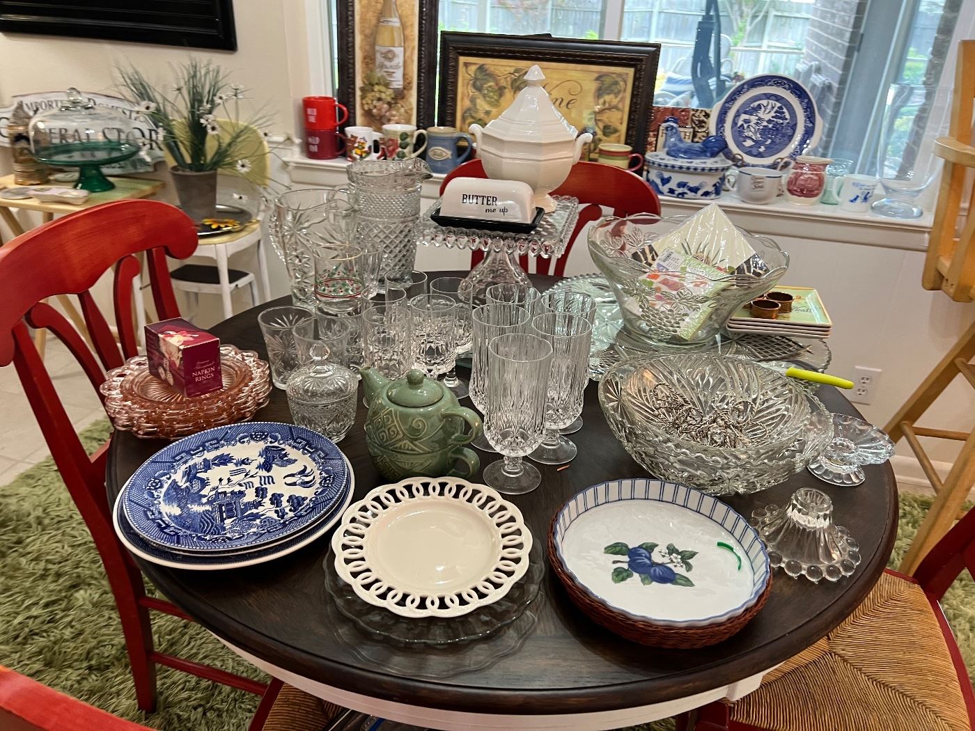 More pictures still coming! We have a very fun sale this weekend! Here are a few of the items that will be available at the sale... - Round kitchen table - Table chairs - Vintage cosco stool - wall art - vintage costume jewelry - huge plate collection - crystal and glassware - Barstool - Porch swing with cover - vintage glasses - Kentucky Derby glasses - copperware - Cookbooks - Fiction reading books - Kids books - Queen size four poster bed - night stands - bed steps - recliners - stationary bike - hand weights - picture frames...