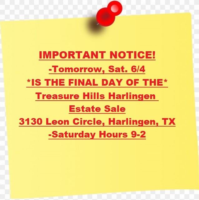 Treasure Hills Harlingen Estate Sale UPDATE: SATURDAY IS THE LAST DAY; NO SALE ON SUNDAY! This Treasure Hills Harlingen estate sale is in the home of a long-time Valley businessman. It is in an older, well-established neighborhood in the heart of Harlingen, in a PACKED two-story house and garage. It is so large that we have to hold it in four days! Everything must go, so it will be priced to sell quickly! We have quality vintage sofas and chairs, beds, tables, bar stools, dressers, occasional tables and chairs--all of it vintage or retro and super cool! There's also a...