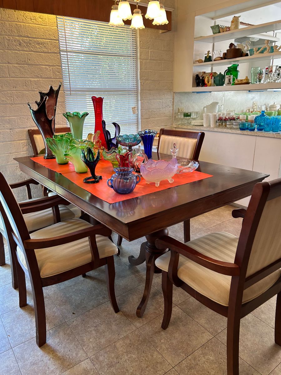 this home is full of antique and collectible glassware, a large vintage camera collection, vintage toys. MCM glassware, 1960s bedrooms set, king size bed, chest of drawers, kitchen items, some tools, new recliner, beautiful table and chairs for 6, sofa tables and living rooms set, chins cabinet, Mexican cabinet and more!