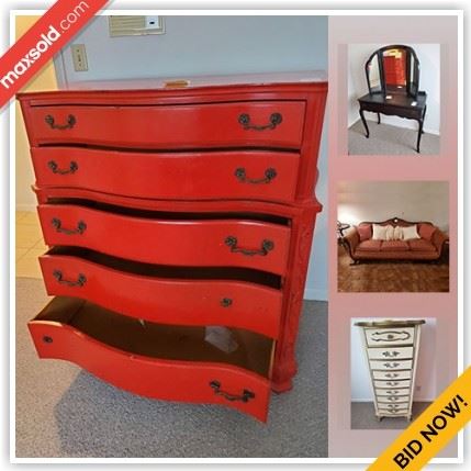 WHAT IS IN THIS AUCTION? This online auction features All Golds Children figures, vintage armchair and couch, coffee table, side table, cabbage patch doll, lamps, Homer Laughlin plates, antique pitcher set, Bonnet Sears lingerie dresser, vintage Bassett furniture, vintage cedar chest, Lenox crystal and much more! HOW TO ACCESS THE AUCTION? Simply click here: MaxSold TO BID PLEASE REGISTER: Copy and paste this link to your browser https://maxsold.maxsold.com/register WHEN DOES THE AUCTION CLOSE? Everything will SELL BY Friday August 23, 2019 7:00 PM regardless of price. Bidding starts at $1. This is an online auction. We do not sell or...