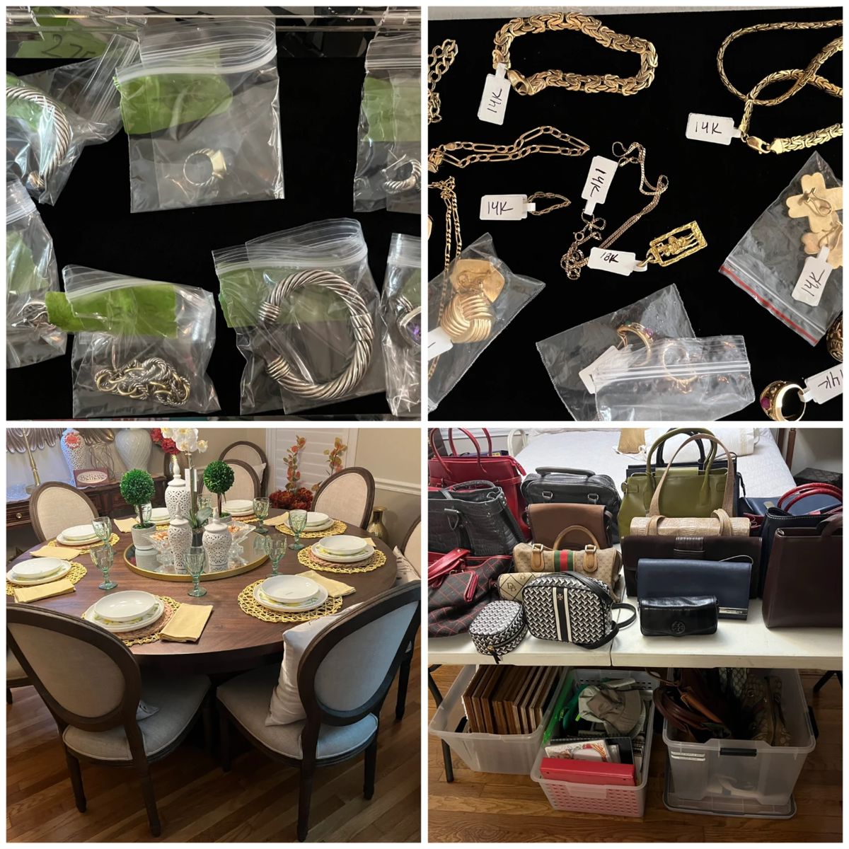 1) All fine jewelry will be brought in day of sale 2) NO LARGE BAGS OR PURSES 3) All jewelry purchases will be bagged/labeled with your name and held until checkout 4) This is Part 1 of this sale - Part 2 will be April 18/19/20 with tons of new items!! 5) Mother's Day is just around the corner!! ​ Jewelry-David Yurman/gold/sterling/costume Lots of beautiful decor!! Mirrors, tables, lamps, artwork, sofa, chairs, round dining table w/10 chairs, armoire, electronics, bar cart, crystal, glassware, Mikasa glasses and dishes, floral, linens-lots!!! all kinds!!!, kitchen items, KitchenAid personal coffee maker, small appliances, vintage...