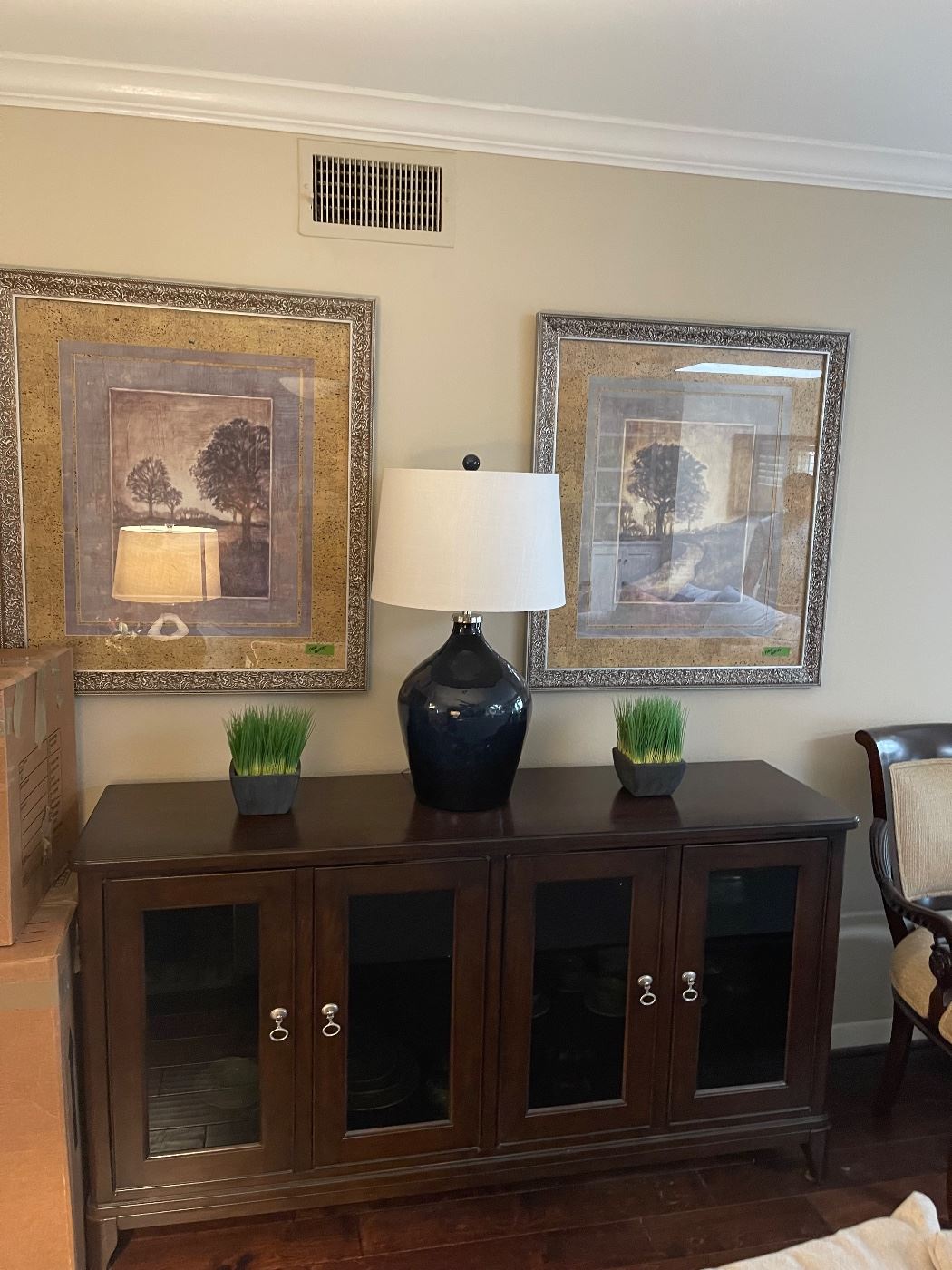Contents of beautiful Briar Forest home sofa loveseat with 2 matching chairs and ottoman, two piece L shaped sofa, lamp tables, Henredon sideboard, pair Duncan Phyfe corner china cabinets, white wood round table and 4 chairs with matching buffet, formal Star Furniture dining table with inlaid design on table top and 6 chairs, curio cabinet with double sliding doors and lighted, wood card table with flip top, needlepoint Victorian chair, pair matching red chairs, small French curio with gold Ormolu trim, Duncan Phyfe chest, small French table with marble top, long 4 door entertainment credenza, Half round entry table, Regency...