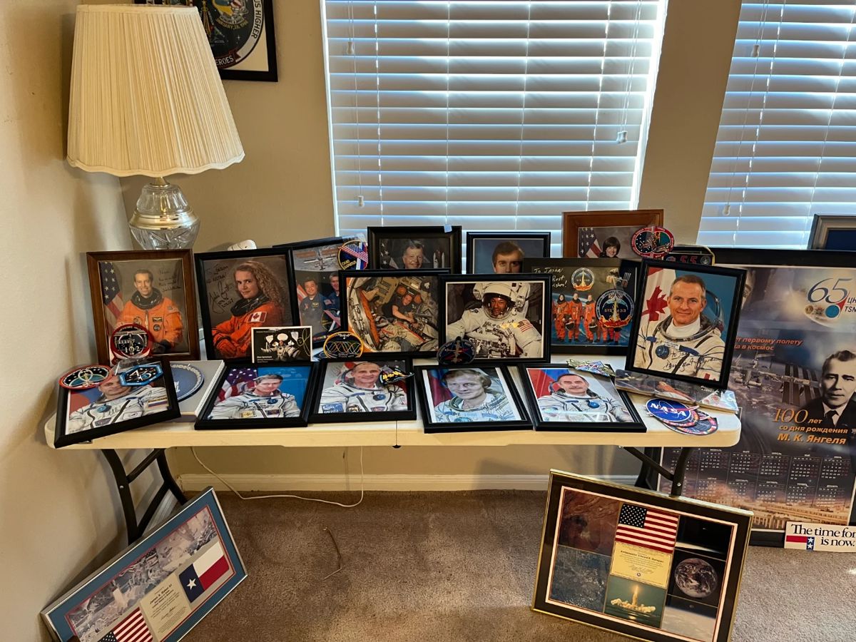 Still have some unboxing to do!! ​ Autographed NASA photos, NASA mission patches/pins/photos/etc, plant stands, small tables-some antique, decor, curio, china, Russian bench & 2 side tables, knick knacks, collectibles, mirrors, mantle clock, depression glass/glassware, dining table w/1 leaf & 6 chairs, buffet, lamps, linens, wooden high chair, chairs, small antique chest, Rug Doctor, wicker bar stools, kitchen items, vintage Pyrex, Whirlpool microwave (mounted), Kenmore gas stove, Kenmore fridge, vintage cookie jars, cookbooks, Kate Spade purses & wallet, artwork, King bed & dresser w/mirror, ProForm elliptical, men's & women's clothes, men's shoes, luggage, books/DVDs/CDs, electronics, leather sofa/loveseat/recliner, coffee & end...