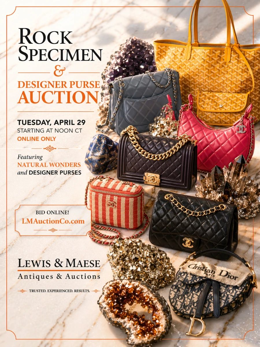 Get ready for one of the most visually stunning and diverse auctions we've hosted at Lewis and Maese Antiques & Auctions. Over 300 stunning crystal specimens and luxury designer bags await. This exclusive Online Rock Specimen & Designer Purse Auction features over 300 carefully curated lots, including breathtaking geodes, crystal specimens, and high-end designer handbags from the most sought-after brands in the world. From massive statement pieces to collectible fossils and polished specimens, this auction offers something for collectors, interior designers, and first-time buyers alike. Many of these items are opening at shockingly low starting prices, creating a rare opportunity...