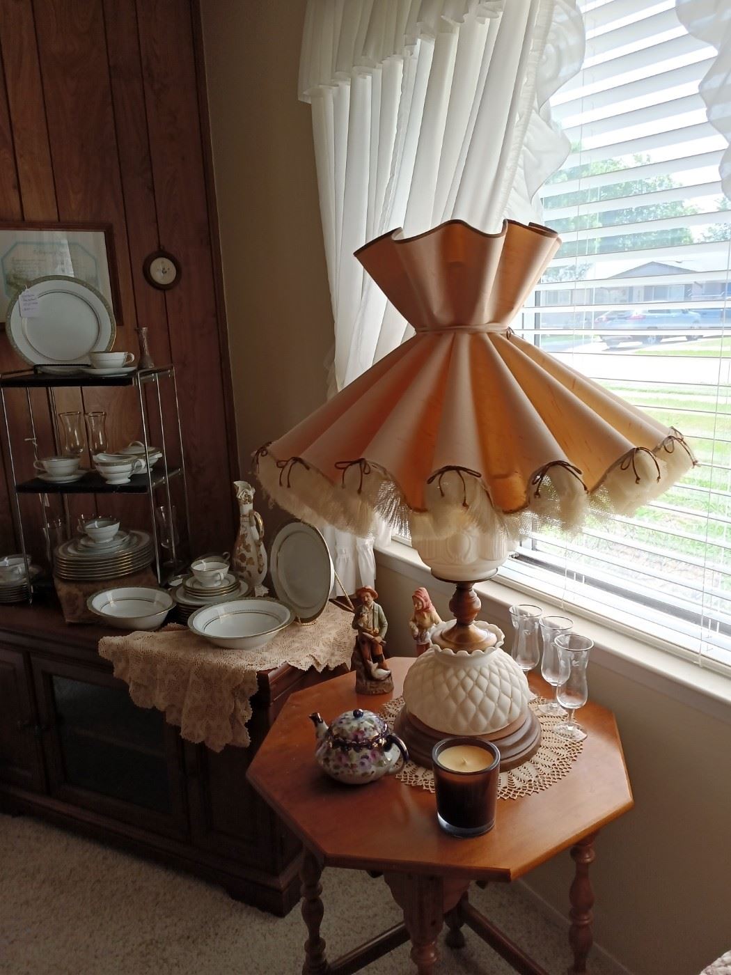 Antique-Vintage handmade quilts • Vintage Ethan Allen nutmeg maple furniture including fiddleback dining chairs, shutter-door cabinets; glass top display units • Vintage milk glass • Johnson the Blues King harmonicas • Pampered Chef, Cuisinart • Paula Deen cookware • Uranium glass juicer • Porcelain animal figurines • Noritake "Thurston" China • Mr. Potato Head sealed 50th Birthday Collectors Edition • Lefton • Homer Laughlin antique and 1949-1984 Skyline Chili coney plates • Dallas Stars pillows, posters • Signed, framed George Strait poster • Corelle "Blue Heather" • Oneida "Calico Rooster" • Thomas Collection Edition Radio • Scentsy (some retired) •...