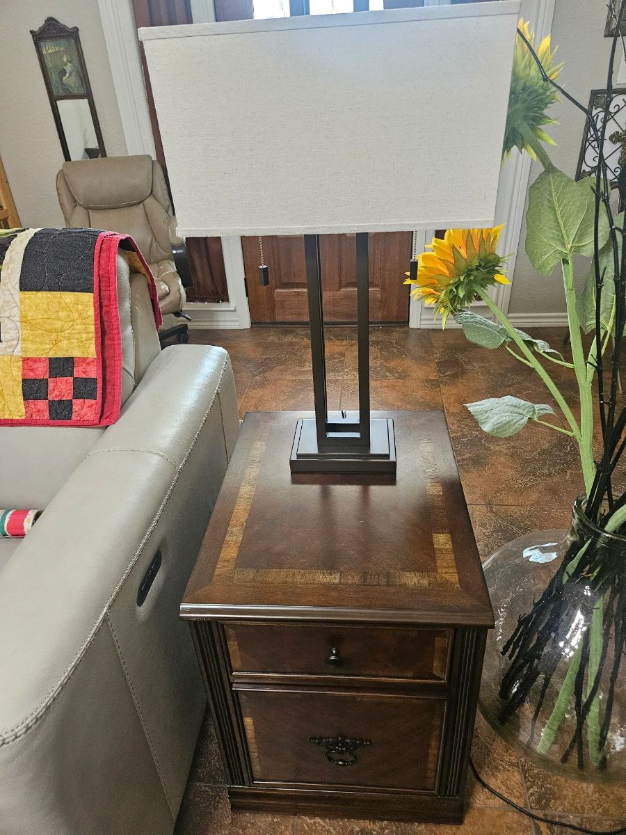FURNITURE- HAVERTY'S 3 PCS MATCHING LEATHER COUCH LOVE- SEAT AND RECLINING CHAIR, ASHLEY HAMLYN DESIGN MAHOGANY FOUR DRAWER COFFEE TABLE, ONE END TABLE WITH TWO DRAWER FILE CABINET. ONE END TABLE ELECTRONIC, ONE DRAWER, FILE CABINET AND LAPTOP STORAGE. WALLACE INFRARED FIREPLACE CHERRY WOOD ENTERTAINMENT CENTER, 2 MATCHING METAL POLE LAMPS WITH 2 MATCHING METAL POLE TABLE LAMPS. 1950'S CHERRY TEA CART, 1850'S CHERRY SEWING CABINET, EARLY 1900'S OAK WASH STAND WITH TOWEL RACK, 2 EARLY 1900'S OAK COMMODES, EARLY 1900'S BIRD'S EYE MAPLE'S SLEIGH BED FRAME DOUBLE SIZE WITH ELECTRONIC ADJUSTABLE FRAME FOR A DOUBLE SIZE. THREE EARLY 1900'S...