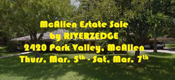 Parkland Estates McAllen Estate Sale A full house plus garage/workshop! Address: 2420 Park Valley, McAllen (in Parkland Estates off of 2nd St.) Map: https://goo.gl/maps/xR6cGRYjs7go1bw6A Dates/Times: Thurs., Mar. 5, 9: 00 a.m. - 4:00 p.m. Fri., Mar. 6, 9:00 a.m. - 4:00 p.m. Sat., Mar. 7, 9:00 a.m. - 2:00 p.m. This Parkland Estates McAllen estate sale is in the very large home of a prominent McAllen dentist. The home is packed with an eclectic mixture of furniture and housewares and decor. Plus, there's a packed workshop/garage. We have a full kitchen, dining room furniture, living room set, bedroom furniture, quality...