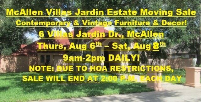 McAllen Villas Jardin Estate Moving Sale Contemporary and Vintage Furniture and Decor! Address: 6 Villas Jardin Dr., McAllen Map: https://goo.gl/maps/VPp22Zrx4wbKiKwm9 NOTE: DUE TO HOA RESTRICTIONS, THE SALE WILL END AT 2:00 P.M. EACH DAY. Dates/Times: Thurs., Aug. 6, 9:00 a.m. - 2:00 p.m. Fri., Aug. 7, 9:00 a.m. - 2:00 p.m. Sat., Aug. 8, 9:00 a.m. - 2:00 p.m. This McAllen Villas Jardin estate sale is in a gorgeous, gated neighborhood near the McAllen Country Club, off of Ben Hogan. It is actually a moving sale. However, the home is still full of clean, quality decor! To start, we have...