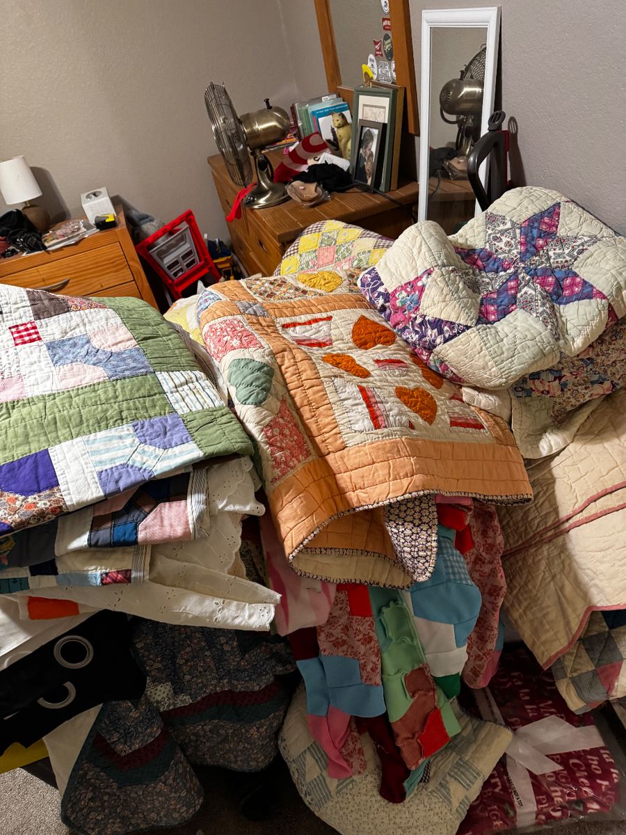 Vintage clothing seller estate sale. Tons of 70s 80s 90s Y2K clothing- men’s women’s, children’s. Antique quilts. Tons of bright floral 70s sheets. Bluetooth turntable. Vintage sewing machines.