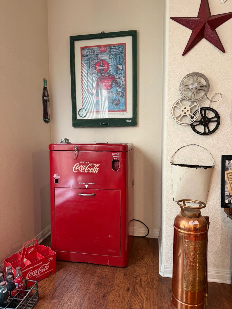Coca Cola Working 1950's A23E Spin top coin op coca cola machine Metal case with some coke bottle red coke carrier vintage metal coca cola with coke bottles Coca Cola bottle shaped Thermometer Coke Print with metal tip tray "They will be gone before you know it" Coke Print "Saturday at the store" Coca Cola mechanical bank 8 Vintage Coca Cola Village Christmas Stainless Candle Holders Other Fun Stuff Chrome barstools with red seats and backs Repro bottle cap clock strawberry soda 78 Turn table 78 Records & 45 Records Vintage Chrome Dial pay telephone, hooked up and works New...