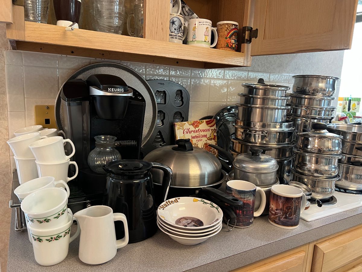 Here is a list of items that will be available at the estate sale.... - Washer and dryer - Upright freezer - pots and pans - jars - bakeware - kitchen utensils - kitchen aid stand mixer - vintage mixer - kitchen trash can - silverware sets - dishes - Fostoria - Pink depression glass - cast iron - Christmas yard decorations - lawn equipment - Weber grill - Christmas tree - vintage toys - mens and women's clothes - new and vintage - men's and women's shoes - belts - purses - table linens - mini trampoline - lots...