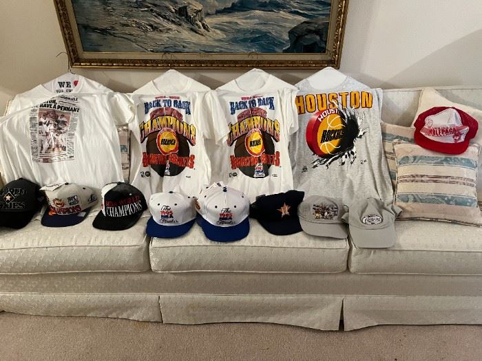 Sorry for the blurry pics in the barn...I had the wrong setting on my camera and didn't realize how blurry they were. ​ Vintage Houston Rockets tshirts and caps, barn full of well packed items! (clean and in good shape!), tools, shelving, kitchen items, vintage Sunbeam mixer, Kitchen Aid mixer, Christmas/Fall/Easter/etc items, clothes - men's & women's, glassware/crystal, towels galore!!, vintage outdoor Tulip chairs, knick knacks, collectibles, bedding, 3 wooden chairs, trunks, small desk, Body Rider elliptical/recumbent bike, lumber, baby cradle, lawn mower, antique wardrobe, antique chest w/mirror, ladders, coolers, floral, small utility trailer, smoker, patio tables/chairs, entry cabinet, hanging...