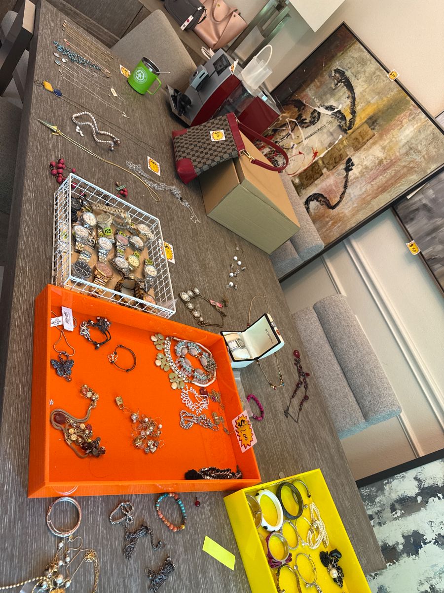 Furniture, new and used clothes, designer new shoes and purses like Gucci, ceilne, Bottege and more. Watches and jewelry, new and used dishes, TV wall art, outdoor furniture, toys, baby clothing, garage sale stuff, rugs, baby furniture 5 pcs set. Queen bed with mattress. Jura Cappuccino machine,