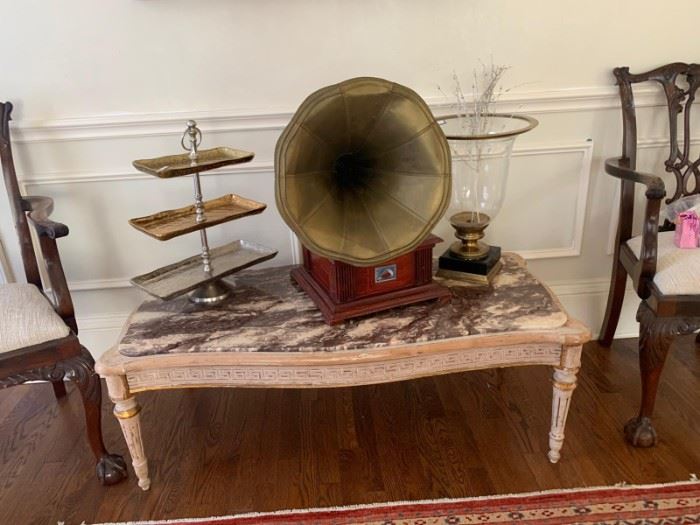 Please check back for more pictures! Louis XV- STYLE marble top Coummode. Empire mahogany lit du jour. Lapis Lazuli and Gilt-Bronze Boudoir Clock. Regency-Style Marble-Top Eagle Console Table. Late Regency Mahogany Sideboard. Per of Marble, Brass and Glass Candelable. Baltic Mahogany and Giltwood Mirror. Pair of Meissen-Style Corbeilles. Continental Bisque Figural Group. French Enameled Bronze and Porcelain Chandelier. Royal Worcester Patent Metallic Persian Ewer. A Sister Parish- Style White Painted and Mirrored Coffee Table. A French Painted Terracotta Bust of a Maiden. Antique chippendale ball and claw 7 pc dinning set Glass top ball and claw 7 pc dinning set...
