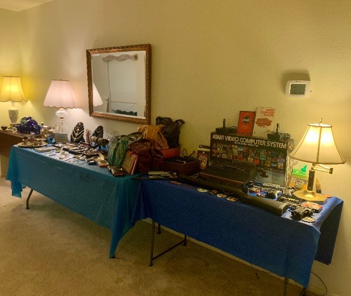 Jewelry, silver, Coach, Chanel, T&C, purses, handbags, Atari 2600, daisy rifle, marksman, Y & P, gold, air soft guns, silver plate, Mikasa, Donkey Kong, Pac Man, U.S. military, Air Force, Military Grade Multimeter Electronics, Furniture, MCM, Mid-Century Modern, Records, LPs, Vinyl, Bicycles, Tools, TVs, China, Glassware, and much more. Front Room Pinto Navajo “Elemental” Small Pot Vintage Semi Vitreous Plate Vintage Colbalt Blue Tilted Pitcher With Eight Matching Glasses Sousa”s Band Harmonica Action International Glass Bird Art Glass Blue Rooster White Shoulders Perfume Dolce & Gabbana Light Blue Eau De Toilette Unsigned Millefiori Glass paperweight Hideo Nomo #368 (1995 Flair)...