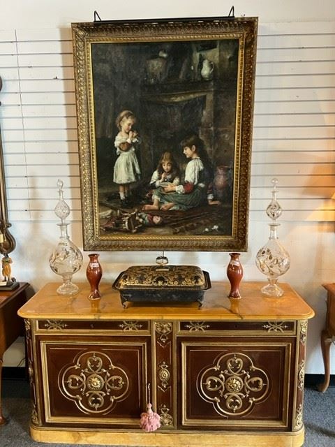 Large Ornately Carved Mahogany Breakfront, Mahogany Dining Table with Two (2) Leaves, Six (6) Black & Gold Chairs by Mastercraft, Two (2) Mahogany Sideboards, Large Custom Aragon Rug in Perfect Condition, Tall Antique French Grandfather Clock, Smaller Antique Scottish Banded Mahogany Grandfather Clock, 19th C Carved French Settee with Aubusson Upholstery, Small Antique French Chest Marble Top Painted Flowers, Ornately Carved Louis XV Full Size Headboard & Footboard, Several Handmade Oriental Rugs, Large Handmade Antique Persian Rug, Several Midcentury Oil Paintings, Baby Grand Piano by Mason & Hamlin with Custom Finish by Mr. Buster, Two Gorgeous Pairs of Chairs, Several...