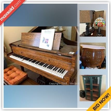 WHAT IS IN THIS AUCTION? This online auction features an Estey Baby Grand piano, Roger drum set. Furniture such as an antique table, many marble topped tables and a Bombe chest, two custom wrought iron with glass shelves display units, red painted cabinet, Chavari dining chairs, a white bedroom suite and more! Collectible Chilean pottery; trinket boxes / music boxes / figurines; Lilliput Lane houses; concert t-shirts. Electronics such as a Vizio 62" flatscreen TV, several printers, several DVD players, elo 22" monitor, Nintendo Game Cube, Guitar Hero guitars, Singer sewing machine. Original paintings. Appliances such as a white fridge....