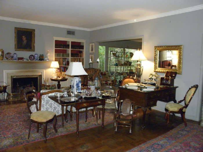 Oh what lovely things we have when you walk into a home filled with treasures. Antiques, Victorian, art, books, Texana, Steuben, rugs, chairs, lamps and a garage filled with camping, hunting and fishing equipment . Treasures galore! FURNITURE: Victorian large sofa in deep plush velvet, antique partners desk, antique Chinese 5 panel screen with semi-precious stones…very special, antique shaving stand, antique child’s folding Victorian rocker, Queen size poster bed with heavily carved tall headboard, Victorian rockers, antique slipper chair and ottoman, antique chairs, Victorian side chairs, Oriental style coffee table with glass insert, square oriental low cocktail table, antique Oriental...