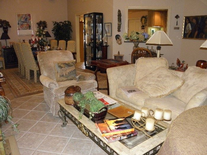 This home has many unusual items including many items that could be for gifts. It is a full garden home that is filled with treasures and furniture with unique collectibles, original art and more. FURNITURE: Large dining table with 2 leaves and 8 Parson style chairs, black wrought iron Bakers Rack with brass detail, long low painted storage buffet, glass and wood lighted curio cabinet, off white loveseat, oatmeal toned chenille armchair and ottoman, rustic side table, Hollywood Regency mirrored console, rustic side cabinet with two drawers, pine rustic small side cabinet, antique Mexican painted bookshelf with brass fish details,...