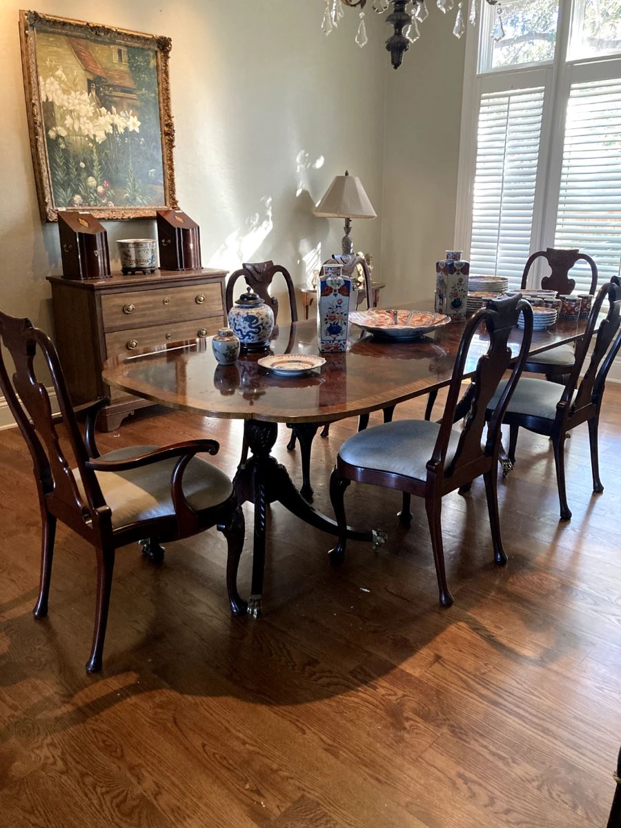 MARCIA HARRIS ANTIQUES & ESTATE SALES, LLC (210) 240-6400 LINCOLN HEIGHTS 7 OXFORD HALL Marcia Harris Antiques & Estate Sales, LLC Shelley Weidner, Cibolo Creek Antiques Invite You to Their Lincoln Heights Estate Sale **VINTAGE**ANTIQUES**QUALITY** *HIGH END HOME WITH HIGH-QUALITY FURNISHINGS" Vintage Baker Furniture Company 1960's "Charleston Group", Mahogany Dining Room Table w/Inlaid Design,, w/2 Leaves, 2 Armchairs & 4 Side Chairs, Pair of Antique Jacobean Style Armchairs w/Ornate Needlepoint Covering, Antique Pine Hanging Wall Corner Cabinet, Antique Round Oak Pub/Card Table, Vintage Walnut Serving Tray on Tall Folding Stand, Traditional Mahogany 3 Drawer Chest w/Brass Hardware, Antique Louis XV...