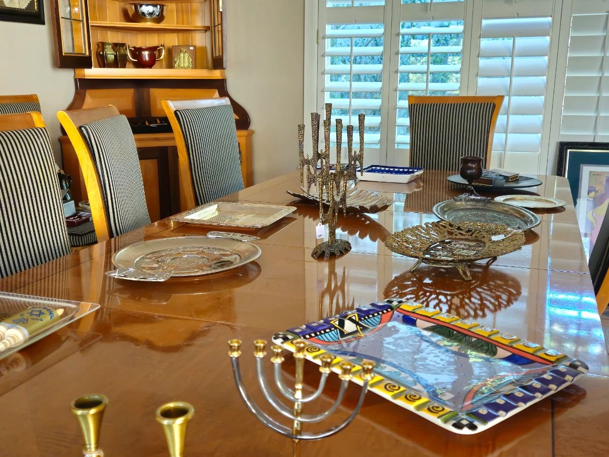Opens 1:00 PM Thursday Exciting collection of artisan Judaica!, Vinyl records, many unusual titles, Broadway Show sound tracks, foreign presses (imports) of big names, children's 33 rpm, 45s, Rare opportunity to buy furniture from South Africa and large- wicker patio furniture., 6' round yellow wood table and six black wood chairs, 9' round rug, Large Thomasville dining table, two leaves, 10 chairs, Lane Credenza and yellow wood corner hutch, Yellow wood whest of drawers, antique hall hat and cloak stand, yellow wood bench, Moderne chair, Extra large curved sectional sofa, chair and two hassocks, Curved home bar, barware, entertaining wares....