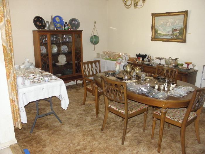 This neighborhood home is filled with interesting items including a 1940's waterfall style buffet, sideboard and china cabinet with burled wood veneer detail, storage buffet, dining table w/ 1 leaf and 6 chairs, vintage rattan sofa & chair, vintage rattan side tables and matching coffee table, mahogany side table, small drop-leaf table, wicker chairs, small wicker stools, wicker table, mahogany side tables, small drop leaf table and 2 Duncan Phyfe chairs, pair of large brown recliners, pair of large blue recliners with built in table between, Sony flat-screen TV, camel stool, teak Mid Century console table, vintage leather chaps, trunks...