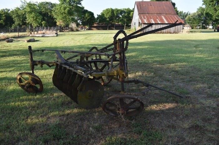 Farm Auction located in Sherman, Texas. Farmall Tractor with several implements, antique tools, plows, chains, boomers, storage cabinets, 10 cu. Ft. yard trailer, tandem disc plow, old cast iron bath tub, John Deere grain drill, 1895 John Deere syrup press, spray tank rig, metal wheels, double wash tub on stand and much much more!