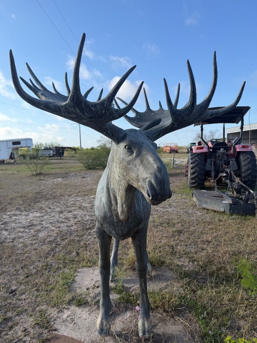 Gooseneck horse trailer, Large dark Bronze sculptured moose, rustic church pew, Wagon wheel rustic tables, Serpentine oak dresser, Antique ornate brass floor lamp, Whiskey barrels, Oak press back rocker, Mill Diamond front slot machine, Soda advertising table set, rustic log stools, benches & tables, Renfrew farm grain platform scale, Antique Secretary desk, Dice cage spinner, Carved spindle rocker, Cowhide wrought-iron bench, Antique National cash register, Vintage fire hydrant, red metal benches, Antique safe,
