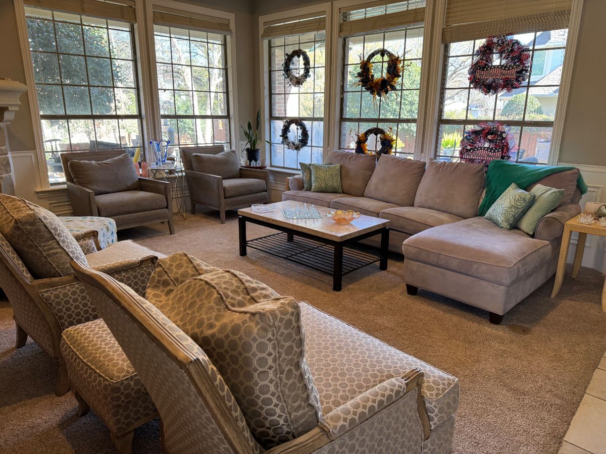 What a beautiful sale we have this week! Stunning furniture, knick knacks and clothes! Here is a list of items that will be available at the sale.... - Beautiful sectional with sleeper sofa - Peloton bike - Accent chairs - Accent pillows - Big green egg - end tables - Tons of Pampered Chef items! - 60 Gallon fish tank with fishes - patio furniture - rattan couch and char - Firepit coffee table - outdoor pub table and stools - Chaise lounges - Teal patio storage (frontgate) - Heavy Pine bench - Cute teal mid century metal patio set...