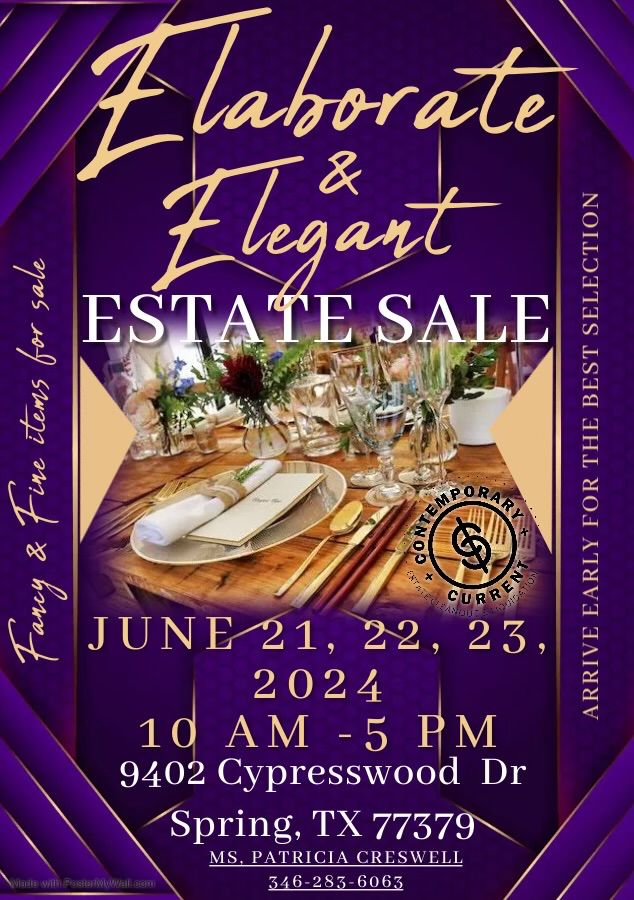 **Elegant & Fancy In The Forest** PARKING IS LIMITED. PLEASE BE PREPARED TO WALK TO THE HOME. You are cordially invited to the most anticipated estate sale of the season, **"Elegant & Fancy In The Forest."** Join us from June 21 through June 23, 2024, from 10:00 AM to 5:00 PM in the stunning neighborhood of Champions Forest. A 1965 Mustang has just been added to the sale! Details provided upon arrival or on the phone inquiries. Explore a curated collection of antiques and exquisite pieces, each one of a kind and rich with history. Whether you're an avid collector...
