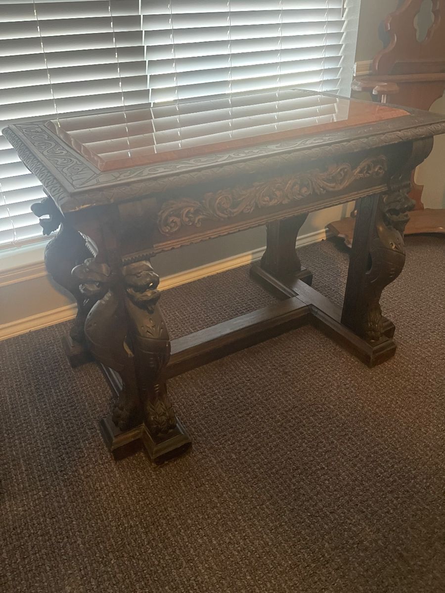 House and garage: heavily carved library table with gargoyles, heavily carved arm chair with gargoyles, oak hall tree, oak umbrella stand, cane collection, Buddha collection, wooden carved dragon, large collection of flow blue, four drawer oak filing cabinet, bookcases, leather hide a bed sofa, queen size bed, lamps, small tables, books, kitchen items, old wooden ladder, small concrete planters, garden items, pictures, large collection of VHS tapes, floral arrangements, much more.