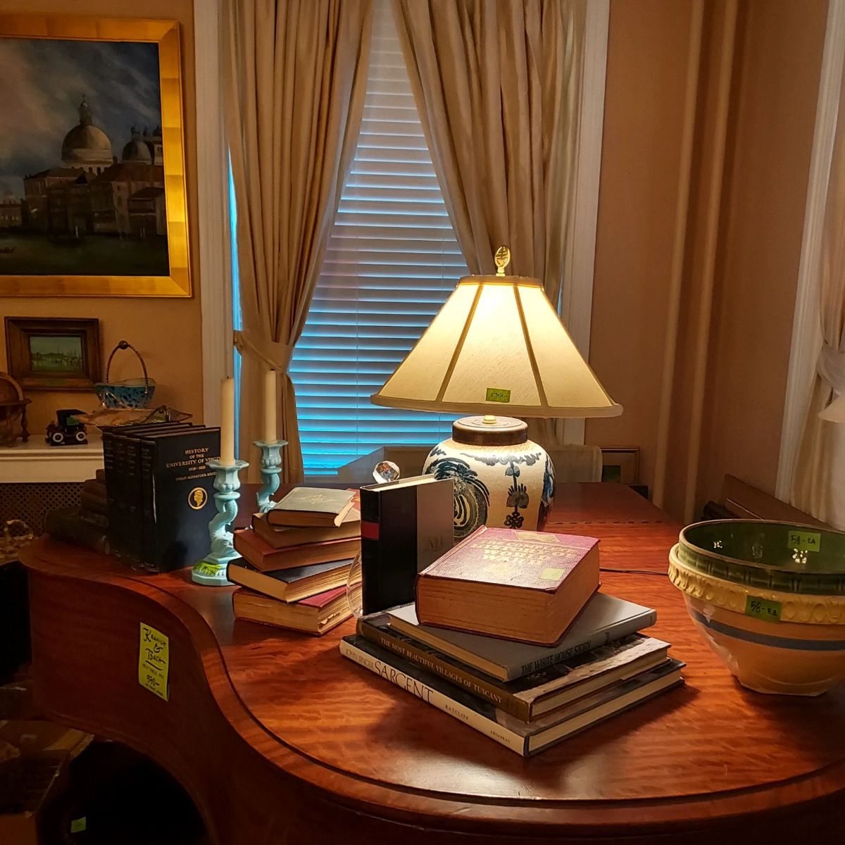 This is a unique 6 generation gathering of family art and antiques seldom seen. Wall art, period and vintage mirrors. Convex Federal mirror with Eagle crest. Fine Game tables. Queen Anne style dining room table and chairs. Eastlake style glass front bookcase or China cupboard Elegant candelabra with crystal prisms Tons of 19th and early 20th century books. Alexandria merchant stenciled stoneware. Wallace silverware "Grand Baroque" pattern. Numerous paintings by a member of the family. Select group of quality kitchen ware. 1838 Connecticut Militia Banner (Framed) Exceptional Victorian Doll Perambulator Pen and Ink of George Washington c1876 Numerous images of...